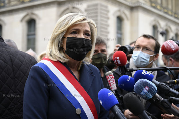 Légende : Marine Le Pen, présidente du Rassemblement National, et Jordan Bardella, vice-président du RN, député européen, au pied de la statue de Jeanne d'Arc pour y déposer une gerbe de fleurs /// Marine Le Pen, President of the far-right Rassemblement National Party, and Jordan Bardella, VP of the RN, MEP, at the foot of the statue of Joan of Arc to lay a wreath flowers - Paris - 01/05/2021 - Photo © Lionel Préau +33 (0)6 68 12 83 77