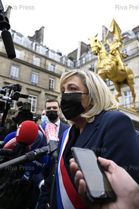 Légende : Marine Le Pen, présidente du Rassemblement National, et Jordan Bardella, vice-président du RN, député européen, au pied de la statue de Jeanne d'Arc pour y déposer une gerbe de fleurs /// Marine Le Pen, President of the far-right Rassemblement National Party, and Jordan Bardella, VP of the RN, MEP, at the foot of the statue of Joan of Arc to lay a wreath flowers - Paris - 01/05/2021 - Photo © Lionel Préau +33 (0)6 68 12 83 77