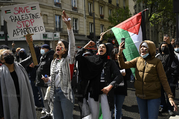 Légende : Près de 3000 personnes manifestent à Paris en soutien au peuple palestinien, malgré l'interdiction des autorités. Les policiers ont dispersé toutes les tentatives de regroupement des manifestants, utilisant canons à eau et gaz lacrymogènes /// Nearly 3,000 people demonstrate in Paris in support of the Palestinian people, despite the ban by the authorities. The police dispersed all attempts to regroup the demonstrators, using water cannons and tear gas - Paris - 15/05/2021 - Photo © Lionel Préau +33 (0)6 68 12 83 77