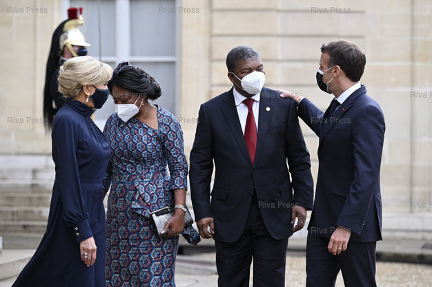 Légende : Emmanuel Macron accueille les chefs d'Etat et de gouvernement et des dirigeants d'organisations internationales participant au Sommet sur le financement des économies africaines, pour le dîner de travail au Palais de L'Elysée. Emmanuel et Brigitte Macron accueillent Joao Lourenco, président de la république d'Angola, et son épouse Ana Dias Lourenco /// Emmanuel Macron welcomes heads of state and government and heads of international organizations participating in the Summit on the financing of African economies, for the working dinner at the Elysée Palace. Emmanuel and Brigitte Macron welcome Joao Lourenco, President of the Republic of Angola, and his wife Ana Dias Lourenco - Paris - 17/05/2021 - Photo © Lionel Préau +33 (0)6 68 12 83 77