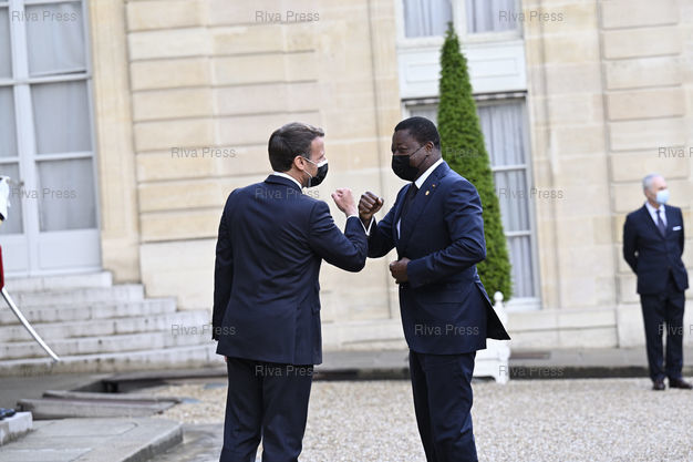Légende : Emmanuel Macron accueille les chefs d'Etat et de gouvernement et des dirigeants d'organisations internationales participant au Sommet sur le financement des économies africaines, pour le dîner de travail au Palais de L'Elysée. Emmanuel Macron accueille Faure Gnassingbe, président de la république du Togo /// Emmanuel Macron welcomes heads of state and government and heads of international organizations participating in the Summit on the financing of African economies, for the working dinner at the Elysée Palace. Emmanuel Macron welcomes Faure Gnassingbe, President of the Republic of Togo - Paris - 17/05/2021 - Photo © Lionel Préau +33 (0)6 68 12 83 77