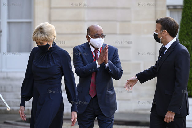 Légende : Emmanuel Macron accueille les chefs d'Etat et de gouvernement et des dirigeants d'organisations internationales participant au Sommet sur le financement des économies africaines, pour le dîner de travail au Palais de L'Elysée. Emmanuel et Brigitte Macron accueillent Mo Ibrahim, président de la Fondation Mo Ibrahim /// Emmanuel Macron welcomes heads of state and government and heads of international organizations participating in the Summit on the financing of African economies, for the working dinner at the Elysée Palace. Emmanuel and Brigitte Macron welcome Mo Ibrahim, president of the Mo Ibrahim Foundation - Paris - 17/05/2021 - Photo © Lionel Préau +33 (0)6 68 12 83 77