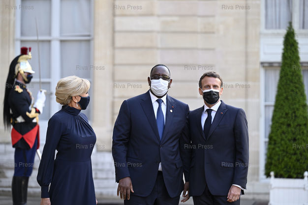 Légende : Emmanuel Macron accueille les chefs d'Etat et de gouvernement et des dirigeants d'organisations internationales participant au Sommet sur le financement des économies africaines, pour le dîner de travail au Palais de L'Elysée. Emmanuel et Brigitte Macron accueillent Macky Sall, président de la république du Sénégal /// Emmanuel Macron welcomes heads of state and government and heads of international organizations participating in the Summit on the financing of African economies, for the working dinner at the Elysée Palace. Emmanuel and Brigitte Macron welcome Macky Sall, President of the Republic of Senegal - Paris - 17/05/2021 - Photo © Lionel Préau +33 (0)6 68 12 83 77