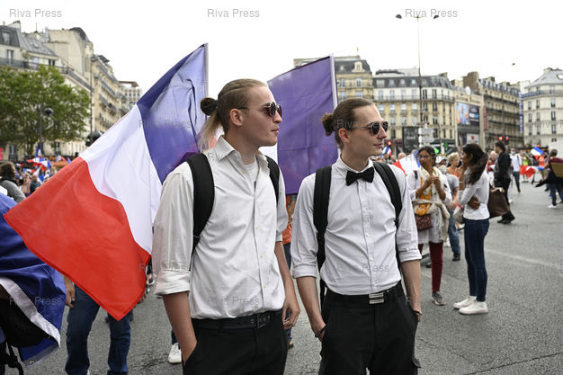 Légende : Manifestation contre l'extension du pass sanitaire, à l'appel de Florian Philippot, ex vice-président du Front national, fondateur du mouvement Les Patriotes et candidat à l'élection présidentielle /// Demonstration against the extension of the health pass, at the call of Florian Philippot, former vice-president of the far-right Front National Party, founder of the Les Patriotes movement and candidate for the presidential election - Paris - 31/07/2021 - Photo © Lionel Préau +33 (0)6 68 12 83 77