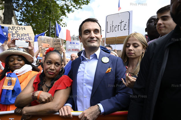 Légende : Manifestation contre l'extension du pass sanitaire, à l'appel de Florian Philippot, ex vice-président du Front national, fondateur du mouvement Les Patriotes et candidat à l'élection présidentielle. Florian Philippot /// Demonstration against the extension of the health pass, at the call of Florian Philippot, former vice-president of the far-right Front National Party, founder of the Les Patriotes movement and candidate for the presidential election. Florian Philippot - Paris - 31/07/2021 - Photo © Lionel Préau +33 (0)6 68 12 83 77