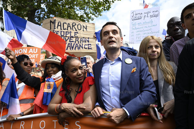 Légende : Manifestation contre l'extension du pass sanitaire, à l'appel de Florian Philippot, ex vice-président du Front national, fondateur du mouvement Les Patriotes et candidat à l'élection présidentielle. Florian Philippot /// Demonstration against the extension of the health pass, at the call of Florian Philippot, former vice-president of the far-right Front National Party, founder of the Les Patriotes movement and candidate for the presidential election. Florian Philippot - Paris - 31/07/2021 - Photo © Lionel Préau +33 (0)6 68 12 83 77