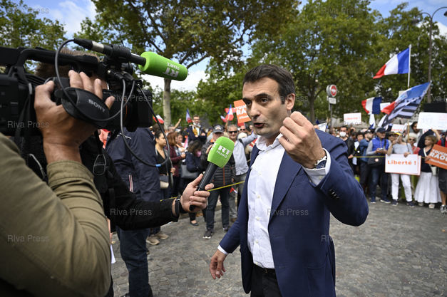Légende : Manifestation contre l'extension du pass sanitaire, à l'appel de Florian Philippot, ex vice-président du Front national, fondateur du mouvement Les Patriotes et candidat à l'élection présidentielle. Florian Philippot interviewé par RT - Russia Today France /// Demonstration against the extension of the health pass, at the call of Florian Philippot, former vice-president of the far-right Front National Party, founder of the Les Patriotes movement and candidate for the presidential election. TV interview of Florian Philippot by Russia Today France - Paris - 28/08/2021 - Photo © Lionel Préau +33 (0)6 68 12 83 77