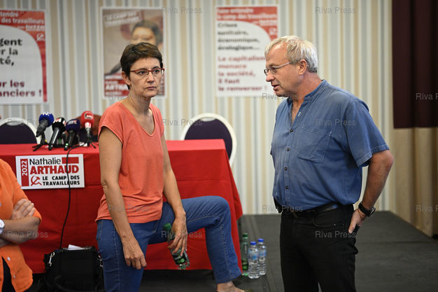 Légende : Nathalie Arthaud, porte-parole de Lutte ouvrière, lance sa campagne de candidate "communiste révolutionnaire" à l'élection présidentielle. En présence de Jean-Pierre Mercier /// Nathalie Arthaud, spokesperson for Lutte Ouvrière, launches her campaign as a "revolutionary communist" candidate for the presidential election. With Jean-Pierre Mercier - Paris - 16/09/2021 - Photo © Lionel Préau +33 (0)6 68 12 83 77