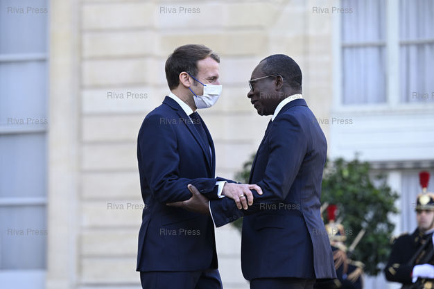 Légende : Emmanuel Macron reçoit Patrice Talon, président de la République du Bénin, au Palais de l’Elysée pour la signature de l'acte de transfert de propriété et finaliser le processus de restitution de 26 œuvres d'art des trésors royaux d'Abomey à la République du Bénin, pillées au XIXe siècle par les troupes coloniales, et conservées jusqu'ici au musée du quai Branly /// Emmanuel Macron receives Patrice Talon, President of the Republic of Benin, at the Elysée Palace for the signing of the deed of transfer of ownership and finalizing the process of restitution of 26 works of art from the royal treasures of Abomey to the Republic of Benin, looted in the 19th century by colonial troops, and kept until now at the Quai Branly museum - Paris - 09/11/2021 - Photo © Lionel Préau +33 (0)6 68 12 83 77