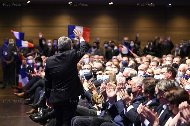 Légende : Valérie Pécresse, candidate Les Républicains à l'élection présidentielle, clôture la réunion avec les cadres du parti. Valérie Pécresse fait applaudir Xavier Bertrand, candidat malheureux à la primaire /// Valérie Pécresse, candidate of the Les Républicains Party for the presidential election, closes the meeting with the party's executives. Valérie Pécresse makes applaud Xavier Bertrand, unhappy candidate for the primary - Paris - 11/12/2021 - Photo © Lionel Préau +33 (0)6 68 12 83 77