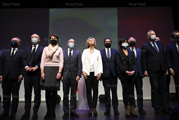 Légende : Valérie Pécresse, candidate Les Républicains à l'élection présidentielle, clôture la réunion avec les cadres du parti. Valérie Pécresse entourée par Xavier Bertrand, Philippe Juvin, Annie Genevard, Eric Ciotti, et Christian Jacob, Rachida Dati, Gérard Larcher, Michel Barnier /// Valérie Pécresse, candidate of the Les Républicains Party for the presidential election, closes the meeting with the party's executives. Valérie Pécresse surrounded by Xavier Bertrand, Philippe Juvin, Annie Genevard, Eric Ciotti, and Christian Jacob, Rachida Dati, Gérard Larcher, Michel Barnier - Paris - 11/12/2021 - Photo © Lionel Préau +33 (0)6 68 12 83 77
