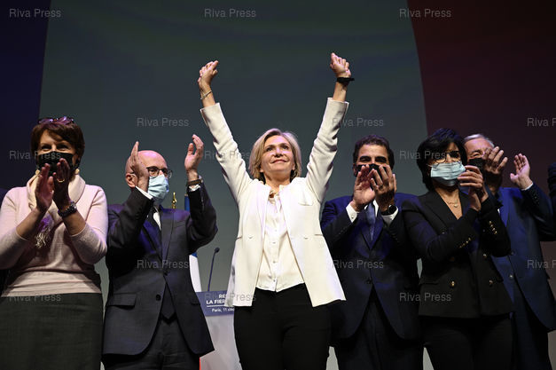 Légende : Valérie Pécresse, candidate Les Républicains à l'élection présidentielle, clôture la réunion avec les cadres du parti. Valérie Pécresse entourée par Annie Genevard, Eric Ciotti, et Christian Jacob, Rachida Dati, Gérard Larcher /// Valérie Pécresse, candidate of the Les Républicains Party for the presidential election, closes the meeting with the party's executives. Valérie Pécresse surrounded by Annie Genevard, Eric Ciotti, and Christian Jacob, Rachida Dati, Gérard Larcher - Paris - 11/12/2021 - Photo © Lionel Préau +33 (0)6 68 12 83 77
