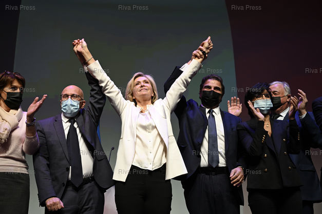 Légende : Valérie Pécresse, candidate Les Républicains à l'élection présidentielle, clôture la réunion avec les cadres du parti. Valérie Pécresse entourée par Annie Genevard, Eric Ciotti, et Christian Jacob, Rachida Dati, Gérard Larcher /// Valérie Pécresse, candidate of the Les Républicains Party for the presidential election, closes the meeting with the party's executives. Valérie Pécresse surrounded by Annie Genevard, Eric Ciotti, and Christian Jacob, Rachida Dati, Gérard Larcher - Paris - 11/12/2021 - Photo © Lionel Préau +33 (0)6 68 12 83 77
