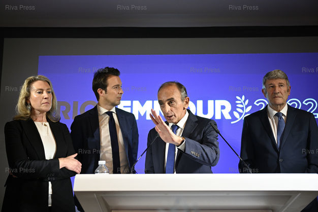 Légende : Eric Zemmour, candidat du parti Reconquête ! à l'élection présidentielle, présente ses voeux à la presse et son programme pour l'éducation. En présence de Guillaume Peltier, directeur de campagne, Laurence Trochu, présidente du Mouvement Conservateur, Philippe de Villiers, ex-président du Mouvement pour la France /// Eric Zemmour, candidate of the Reconquête ! party to the presidential election, presents his best wishes for the new year to the press and his program for education. With Guillaume Peltier, campaign director, Laurence Trochu, president of the Mouvement Conservateur, Philippe de Villiers, ex-president of the Mouvement pour la France - Paris - 10/01/2022 - Photo © Lionel Préau +33 (0)6 68 12 83 77