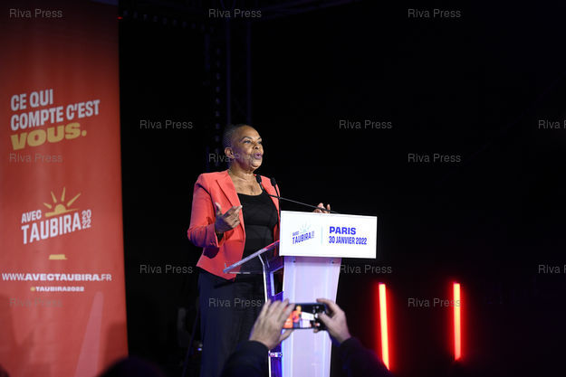 Légende : Déclaration de Christiane Taubira, gagnante de la Primaire populaire, qui ne parvient pas à unir la gauche pour une candidature unique à l'élection présidentielle /// Statement by Christiane Taubira, winner of the Popular Primary, who fails to unite the left for a single presidential candidacy - Paris - 30/01/2022 - Photo © Lionel Préau +33 (0)6 68 12 83 77