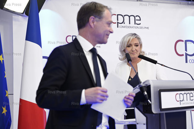 Légende : La CPME, Confédération des petites et moyennes entreprises, reçoit Marine Le Pen, candidate du Rassemblement national, dans le cadre de ses auditions de candidats à la présidentielle. François Asselin, président de la CPME, et Marine le Pen /// The CPME, Confederation of Small and Medium-Sized Enterprises, receives Marine Le Pen, candidate of the Rassemblement National party, as part of its hearings for presidential candidates. François Asselin, President of CPME, and Marine Le Pen - Paris - 09/03/2022 - Photo © Lionel Préau +33 (0)6 68 12 83 77
