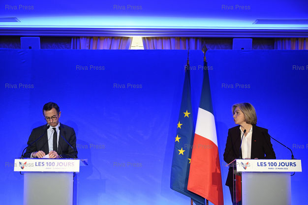 Légende : Valérie Pécresse, candidate LR à l'élection présidentielle, présente le programme des 100 premiers jours de son quinquennat si elle est élue. En présence de Bruno Retailleau /// Valérie Pécresse, candidate of Les Républicains party in the presidential election, presents the program for the first 100 days of her five-year term if she is elected. With Bruno Retailleau - Paris - 31/03/2022 - Photo © Lionel Préau +33 (0)6 68 12 83 77