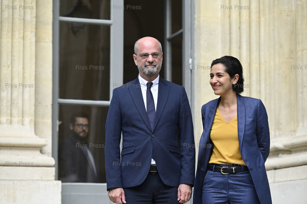 Légende : Passation des pouvoirs entre Jean-Michel Blanquer et Pap Ndiaye, nouveau ministre de l'Education nationale et de la Jeunesse. Jean-Michel Blanquer et Sarah El Hairy, ex-secrétaire d'Etat /// Transfer of powers between Jean-Michel Blanquer and Pap Ndiaye, new Minister of National Education and Youth. Jean-Michel Blanquer and Sarah El Hairy, former junior minister - Paris - 20/05/2022 - Photo © Lionel Préau +33 (0)6 68 12 83 77