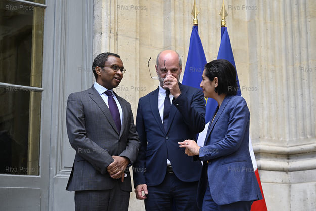 Légende : Passation des pouvoirs entre Jean-Michel Blanquer et Pap Ndiaye, nouveau ministre de l'Education nationale et de la Jeunesse. En présence de Sarah El Hairy, ex-Secrétaire d'Etat /// Transfer of powers between Jean-Michel Blanquer and Pap Ndiaye, new Minister of National Education and Youth. With Sarah El Hairy, former junior minister - Paris - 20/05/2022 - Photo © Lionel Préau +33 (0)6 68 12 83 77