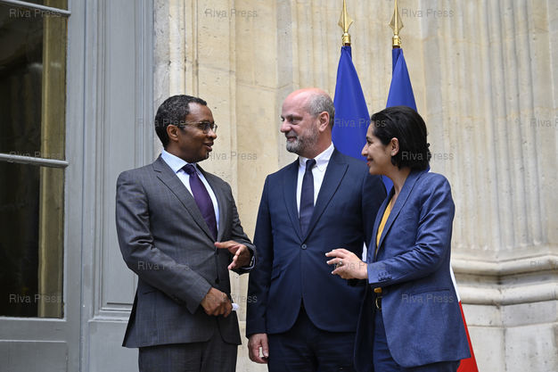 Légende : Passation des pouvoirs entre Jean-Michel Blanquer et Pap Ndiaye, nouveau ministre de l'Education nationale et de la Jeunesse. En présence de Sarah El Hairy, ex-Secrétaire d'Etat /// Transfer of powers between Jean-Michel Blanquer and Pap Ndiaye, new Minister of National Education and Youth. With Sarah El Hairy, former junior minister - Paris - 20/05/2022 - Photo © Lionel Préau +33 (0)6 68 12 83 77