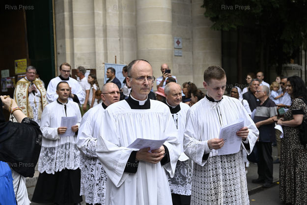 Caption : Procession en l'honneur de l'Assomption dans les rues du Vème arrondissement de Paris par les catholiques traditionalistes de l'église Saint-Nicolas-du-Chardonnet. Abbé Guillaume d'Orsanne /// Procession in honor of the Assumption in the streets of the 5th arrondissement of Paris by the traditionalist Catholics of the church of Saint-Nicolas-du-Chardonnet. Father Guillaume d'Orsanne - Paris - 15/08/2022 - Photo © Lionel Préau +33 (0)6 68 12 83 77