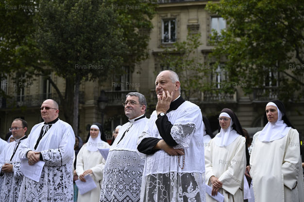 Légende : Procession en l'honneur de l'Assomption dans les rues du Vème arrondissement de Paris par les catholiques traditionalistes de l'église Saint-Nicolas-du-Chardonnet /// Procession in honor of the Assumption in the streets of the 5th arrondissement of Paris by the traditionalist Catholics of the church of Saint-Nicolas-du-Chardonnet - Paris - 15/08/2022 - Photo © Lionel Préau +33 (0)6 68 12 83 77