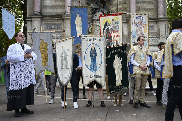 Légende : Procession en l'honneur de l'Assomption dans les rues du Vème arrondissement de Paris par les catholiques traditionalistes de l'église Saint-Nicolas-du-Chardonnet /// Procession in honor of the Assumption in the streets of the 5th arrondissement of Paris by the traditionalist Catholics of the church of Saint-Nicolas-du-Chardonnet - Paris - 15/08/2022 - Photo © Lionel Préau +33 (0)6 68 12 83 77