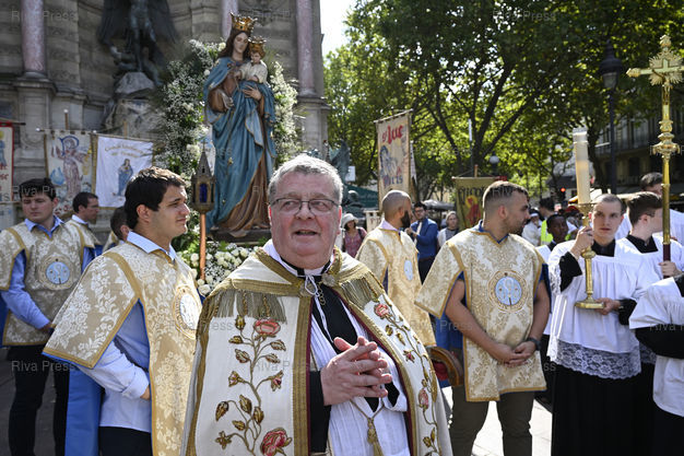 Légende : Procession en l'honneur de l'Assomption dans les rues du Vème arrondissement de Paris par les catholiques traditionalistes de l'église Saint-Nicolas-du-Chardonnet. L'abbé Christian Bouchacourt /// Procession in honor of the Assumption in the streets of the 5th arrondissement of Paris by the traditionalist Catholics of the church of Saint-Nicolas-du-Chardonnet. Father Christian Bouchacourt - Paris - 15/08/2022 - Photo © Lionel Préau +33 (0)6 68 12 83 77