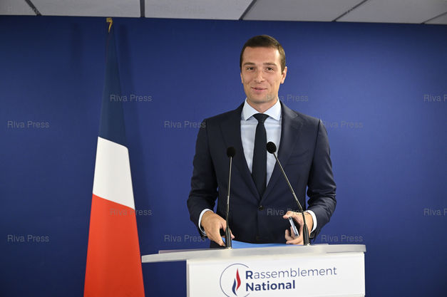 Légende : Jordan Bardella, président par intérim du Rassemblement national, lance la nouvelle campagne nationale du RN sur la Justice "Rompre avec le Dupond-Morettisme" lors d'une conférence de presse /// Jordan Bardella, acting president of the Rassemblement National party, launches the RN's new national campaign on Justice "Break with Dupond-Morettism" during a press conference - Paris - 08/09/2022 - Photo © Lionel Préau +33 (0)6 68 12 83 77