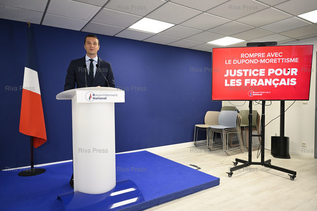 Caption : Jordan Bardella, président par intérim du Rassemblement national, lance la nouvelle campagne nationale du RN sur la Justice "Rompre avec le Dupond-Morettisme" lors d'une conférence de presse /// Jordan Bardella, acting president of the Rassemblement National party, launches the RN's new national campaign on Justice "Break with Dupond-Morettism" during a press conference - Paris - 08/09/2022 - Photo © Lionel Préau +33 (0)6 68 12 83 77
