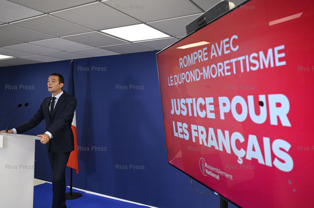 Légende : Jordan Bardella, président par intérim du Rassemblement national, lance la nouvelle campagne nationale du RN sur la Justice "Rompre avec le Dupond-Morettisme" lors d'une conférence de presse /// Jordan Bardella, acting president of the Rassemblement National party, launches the RN's new national campaign on Justice "Break with Dupond-Morettism" during a press conference - Paris - 08/09/2022 - Photo © Lionel Préau +33 (0)6 68 12 83 77