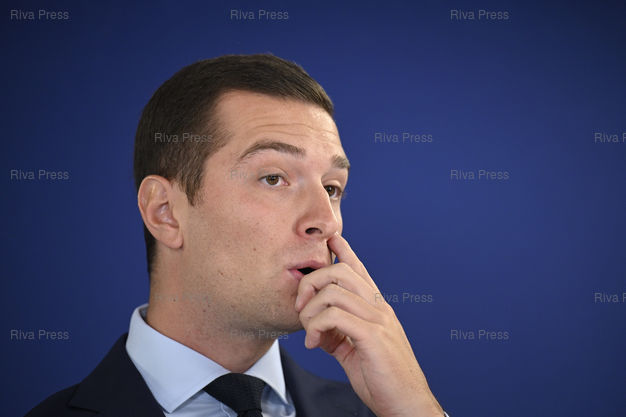 Légende : Jordan Bardella, président par intérim du Rassemblement national, lance la nouvelle campagne nationale du RN sur la Justice "Rompre avec le Dupond-Morettisme" lors d'une conférence de presse /// Jordan Bardella, acting president of the Rassemblement National party, launches the RN's new national campaign on Justice "Break with Dupond-Morettism" during a press conference - Paris - 08/09/2022 - Photo © Lionel Préau +33 (0)6 68 12 83 77