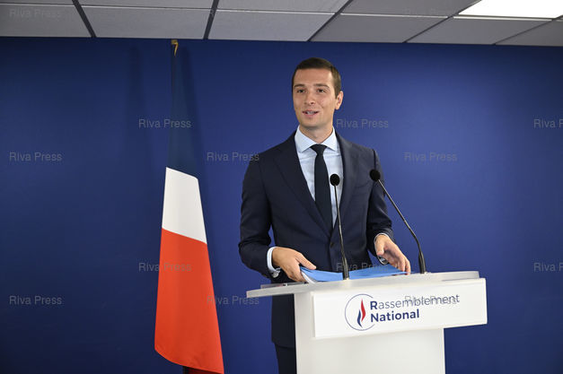 Caption : Jordan Bardella, président par intérim du Rassemblement national, lance la nouvelle campagne nationale du RN sur la Justice "Rompre avec le Dupond-Morettisme" lors d'une conférence de presse /// Jordan Bardella, acting president of the Rassemblement National party, launches the RN's new national campaign on Justice "Break with Dupond-Morettism" during a press conference - Paris - 08/09/2022 - Photo © Lionel Préau +33 (0)6 68 12 83 77