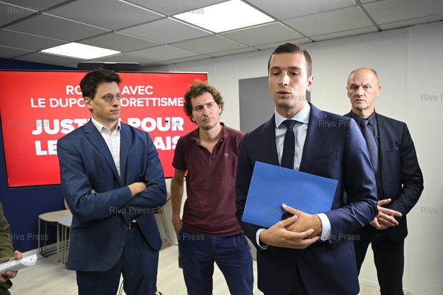 Caption : Jordan Bardella, président par intérim du Rassemblement national, lance la nouvelle campagne nationale du RN sur la Justice "Rompre avec le Dupond-Morettisme" lors d'une conférence de presse /// Jordan Bardella, acting president of the Rassemblement National party, launches the RN's new national campaign on Justice "Break with Dupond-Morettism" during a press conference - Paris - 08/09/2022 - Photo © Lionel Préau +33 (0)6 68 12 83 77