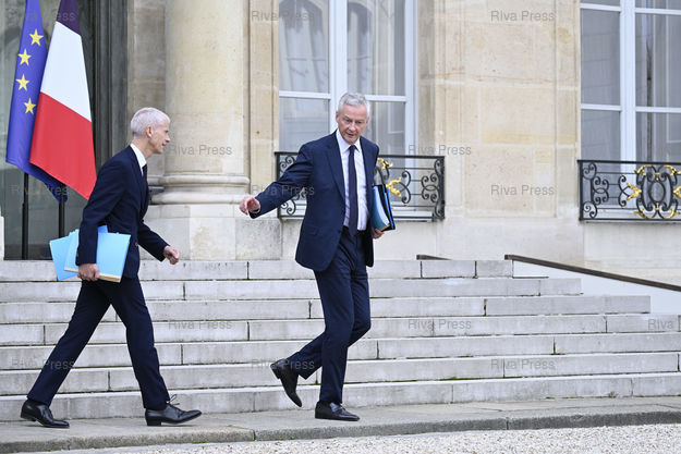 Légende : Conseil des ministres au palais de l'Elysée. Franck Riester, ministre délégué chargé des Relations avec le Parlement - Bruno Le Maire, ministre de l'Economie, des Finances et de la Souveraineté industrielle et numérique /// Cabinet meeting at the Elysee Palace. Franck Riester, Minister Delegate in charge of Relations with Parliament - Bruno Le Maire, Minister of Economy, Finance and Industrial and Digital Sovereignty - Paris - 05/10/2022 - Photo © Lionel Préau +33 (0)6 68 12 83 77
