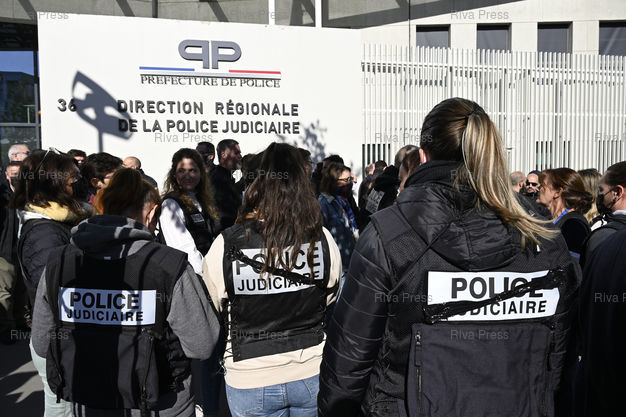 Légende : Des membres de la "Police judiciaire" se rassemblent devant leur QG parisien pour montrer leur soutien au directeur de la PJ de la zone sud de la France Eric Arella, limogé le lendemain d’une manifestation contre la réforme de la PJ /// Members of the "Judicial Police" gather outside their Paris headquarters to show their support for the director of the PJ of the southern zone of France Eric Arella, sacked the day after a demonstration against the reform of the PJ - Paris - 11/10/2022 - Photo © Lionel Préau +33 (0)6 68 12 83 77