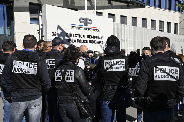 Légende : Des membres de la "Police judiciaire" se rassemblent devant leur QG parisien pour montrer leur soutien au directeur de la PJ de la zone sud de la France Eric Arella, limogé le lendemain d’une manifestation contre la réforme de la PJ /// Members of the "Judicial Police" gather outside their Paris headquarters to show their support for the director of the PJ of the southern zone of France Eric Arella, sacked the day after a demonstration against the reform of the PJ - Paris - 11/10/2022 - Photo © Lionel Préau +33 (0)6 68 12 83 77
