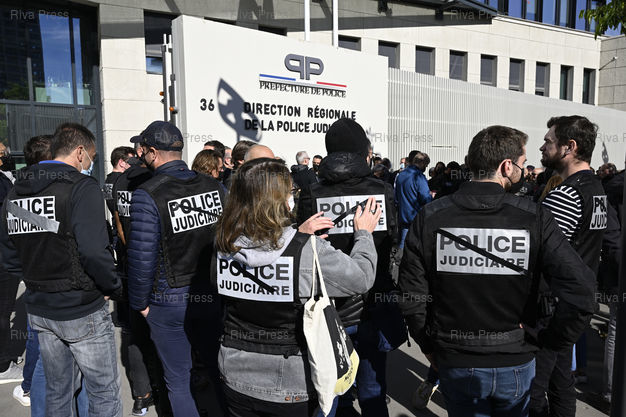 Légende : Des membres de la "Police judiciaire" se rassemblent devant leur QG parisien pour montrer leur soutien au directeur de la PJ de la zone sud de la France Eric Arella, limogé le lendemain d’une manifestation contre la réforme de la PJ /// Members of the "Judicial Police" gather outside their Paris headquarters to show their support for the director of the PJ of the southern zone of France Eric Arella, sacked the day after a demonstration against the reform of the PJ - Paris - 11/10/2022 - Photo © Lionel Préau +33 (0)6 68 12 83 77