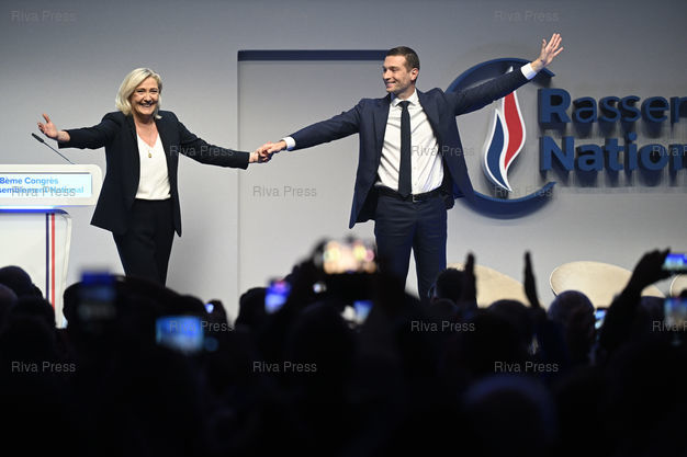 Caption : Congrès du Rassemblement National. Marine Le Pen et Jordan Bardella, élu nouveau président du RN /// Congress of the Rassemblement National far-right party. Marine Le Pen and Jordan Bardella, elected new President of the RN - Paris - 05/11/2022 - Photo © Lionel Préau +33 (0)6 68 12 83 77