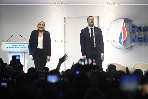 Légende : Congrès du Rassemblement National. Marine Le Pen et Jordan Bardella, élu nouveau président du RN /// Congress of the Rassemblement National far-right party. Marine Le Pen and Jordan Bardella, elected new President of the RN - Paris - 05/11/2022 - Photo © Lionel Préau +33 (0)6 68 12 83 77