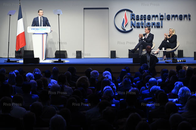 Caption : Congrès du Rassemblement National. Discours de Jordan Bardella, nouveau président du RN, en présence de Louis Aliot et Marine Le Pen /// Congress of the Rassemblement National far-right party. Speech of Jordan Bardella, new President of the RN, Louis Aliot and Marine Le Pen - Paris - 05/11/2022 - Photo © Lionel Préau +33 (0)6 68 12 83 77