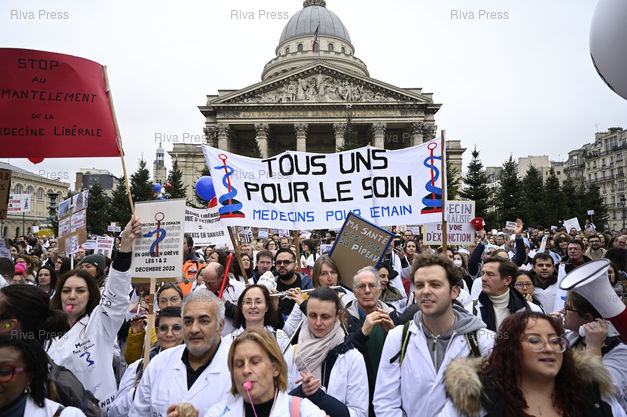 Légende : Les médecins libéraux en grève manifestent pour obtenir une revalorisation du tarif de consultation /// Liberal doctors on strike demonstrate to obtain a revaluation of the consultation fee - Paris - 05/01/2023 - Photo © Lionel Préau +33 (0)6 68 12 83 77