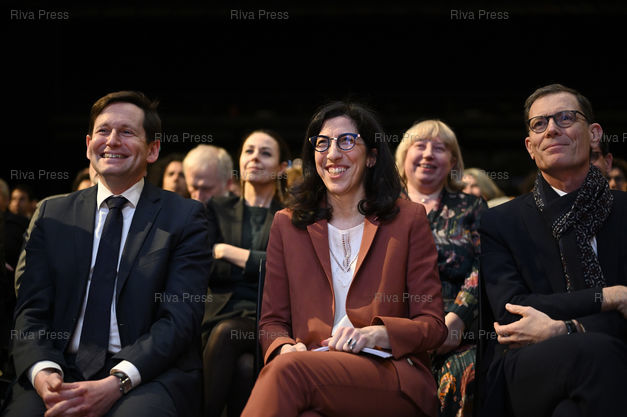 Légende : Rima Abdul Malak, ministre de la culture, présente ses voeux aux acteurs culturels à la Grande Halle de la Villette. En présence d'Emmanuel Marcovitch, directeur de cabinet, et de Laurent Lafon, président de la commission de la Culture et de l'Éducation du Sénat /// Rima Abdul Malak, Minister of Culture, presents her best wishes to cultural stakeholders at the Grande Halle de la Villette. With Emmanuel Marcovitch, chief of staff, and Laurent Lafon, Chairman of the Senate Culture and Education Committee - Paris - 16/01/2023 - Photo © Lionel Préau +33 (0)6 68 12 83 77