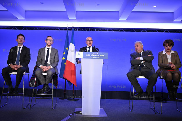 Légende : Eric Ciottin président des Républicains, présente ses voeux. En présence de François-Xavier Bellamy, Bruno Retailleau, Gérard Larcher, Annie Genevard /// Eric Ciotti, President of Les Républicains party, presents his best wishes for 2023. With François-Xavier Bellamy, Bruno Retailleau, Gérard Larcher, Annie Genevard - Paris - 24/01/2023 - Photo © Lionel Préau +33 (0)6 68 12 83 77