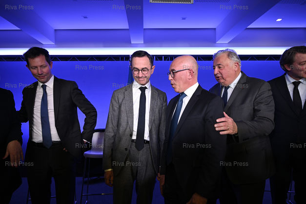 Légende : Eric Ciottin président des Républicains, présente ses voeux. En présence de François-Xavier Bellamy, Bruno Retailleau, Gérard Larcher, François Baroin /// Eric Ciotti, President of Les Républicains party, presents his best wishes for 2023. With François-Xavier Bellamy, Bruno Retailleau, Gérard Larcher, François Baroin - Paris - 24/01/2023 - Photo © Lionel Préau +33 (0)6 68 12 83 77