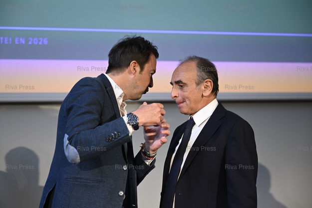 Légende : Convention électorale de Reconquête, qui rassemble les futurs candidats du parti pour une journée de formation dédiée aux élections législatives anticipées et aux élections municipales. Guillaume Peltier, vice-président de Reconquête - Eric Zemmour, président de Reconquête /// Electoral Convention of the far-right Reconquete party, which brings together future party candidates for a day of training dedicated to early legislative elections and municipal elections. Guillaume Peltier, VP of Reconquete - Eric Zemmour, president of Reconquête - Paris - 15/04/2023 - Photo © Lionel Préau +33 (0)6 68 12 83 77