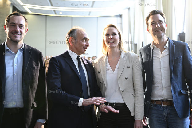 Légende : Convention électorale de Reconquête, qui rassemble les futurs candidats du parti pour une journée de formation dédiée aux élections législatives anticipées et aux élections municipales. Eric Zemmour, président de Reconquête, avec les vice-présidents Nicolas Bay, Marion Maréchal et Guillaume Peltier /// Electoral Convention of the far-right Reconquete party, which brings together future party candidates for a day of training dedicated to early legislative elections and municipal elections. Eric Zemmour, president of Reconquête, with Vice President Nicolas Bay, Marion Maréchal, Guillaume Peltier - Paris - 15/04/2023 - Photo © Lionel Préau +33 (0)6 68 12 83 77