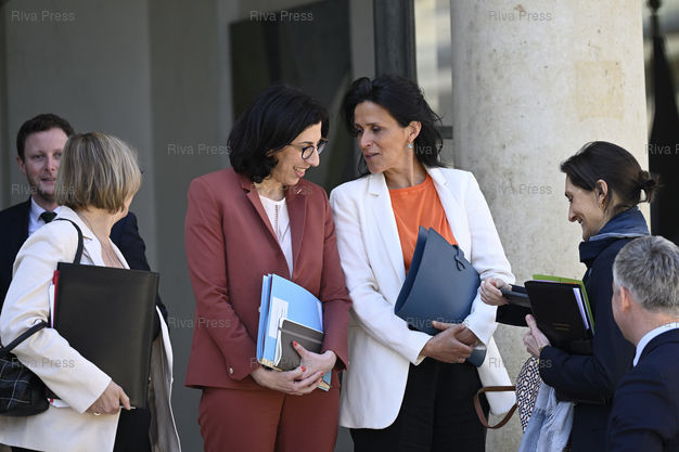 Légende : Conseil des ministres au palais de l'Elysée. Rima Abdul-Malak, ministre de la Culture - Chrysoula Zacharopoulou, secrétaire d'Etat chargée du Développement, de la Francophonie et des Partenariats internationaux /// Cabinet meeting at the Elysee Palace. Rima Abdul-Malak, Minister of Culture - Chrysoula Zacharopoulou, junior minister for Development, Francophonie and International Partnerships - Paris - 03/05/2023 - Photo © Lionel Préau +33 (0)6 68 12 83 77