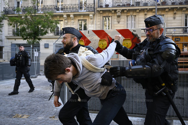 Légende : Des militants pour le climat tentent de bloquer l'Assemblée générale des actionnaires du géant pétrolier et gazier TotalEnergies /// Climate activists try to block General Meeting of Shareholders of oil and gas giant TotalEnergies - Paris - 26/05/2023 - Photo © Lionel Préau +33 (0)6 68 12 83 77