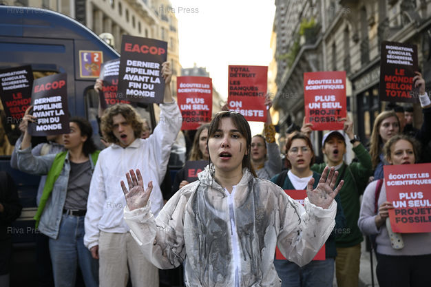 Légende : Des militants pour le climat tentent de bloquer l'Assemblée générale des actionnaires du géant pétrolier et gazier TotalEnergies /// Climate activists try to block General Meeting of Shareholders of oil and gas giant TotalEnergies - Paris - 26/05/2023 - Photo © Lionel Préau +33 (0)6 68 12 83 77